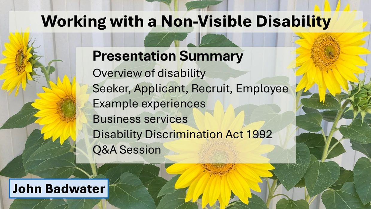 The presentation incorporates lived experience into developing business solutions to support and enable job applicants, candidates, new recruits and existing employees, contractors and temporary staff with disabilities. It includes an overview of my journey with a non-visible disability and its effects on my career and professional life. Real-life workplace situations provide a perspective from the person with the disability.